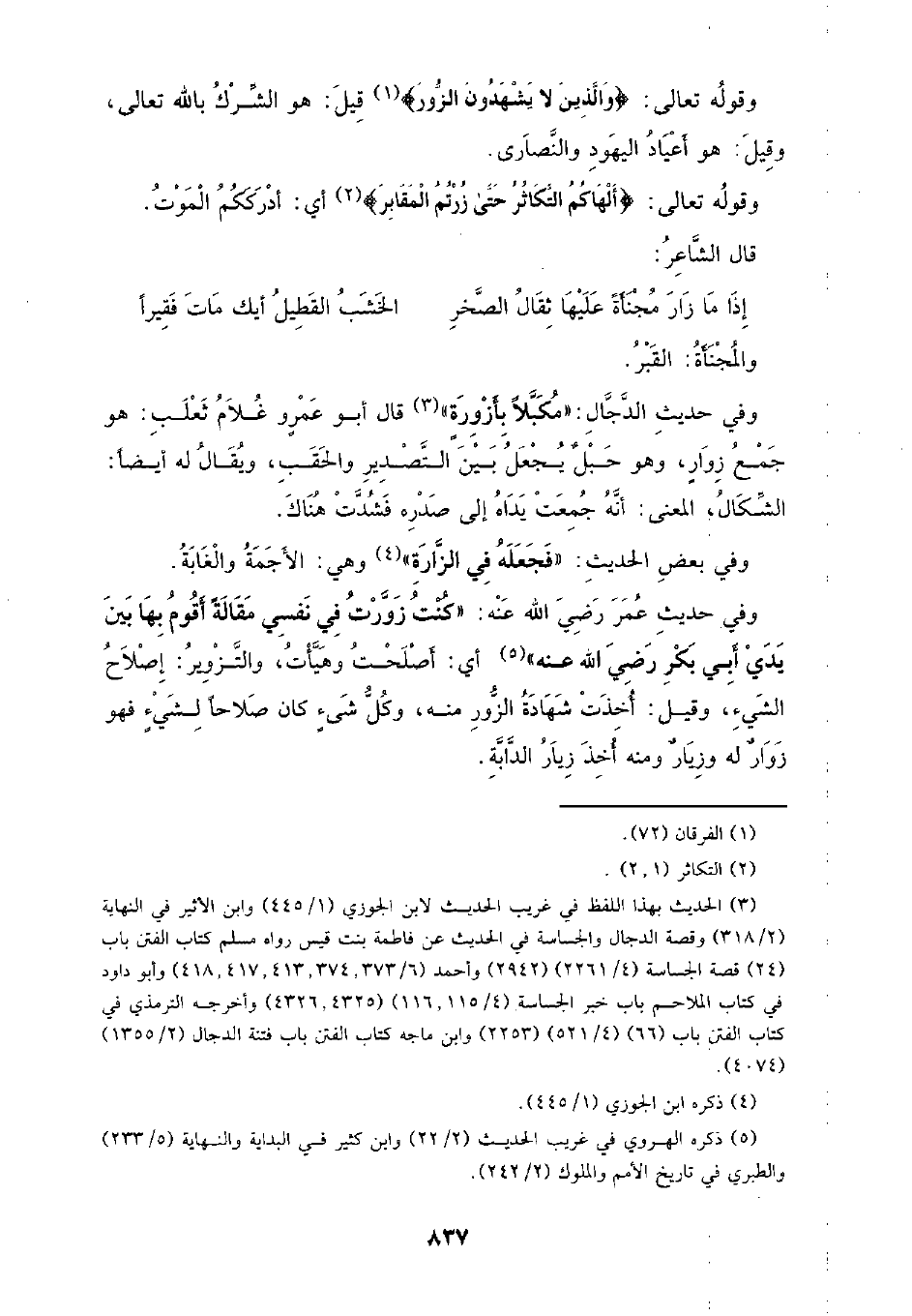 وفي حديث عمر - رضي الله عنه -: (كنت زورت في نفسي مقالة أقوم بها بين يدي أبي بكر - رضي الله عنه -) أي: أصلحت وهيأت، والتزوير: إصلاح الشيء، وقيل: أخذت شهادة الزور منه، وكل شيء كان صلاحًا لشيء فهو زوار له وزيار ومنه أخذ زيار الدابة.