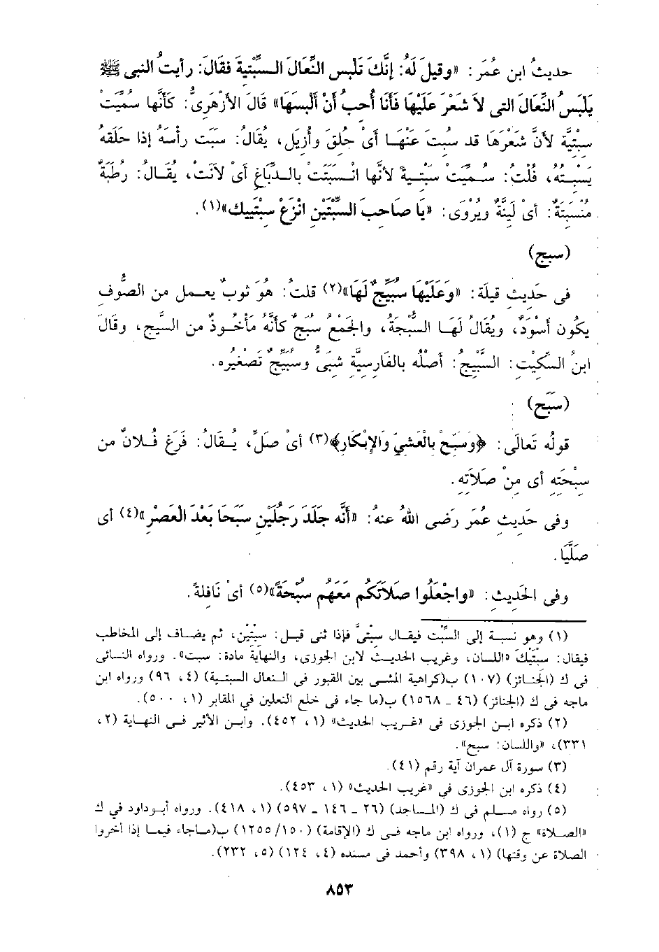 حديث ابن عمر: (وقيل له: إنك تلبس النعال السبتية فقال: رأيت النبي - صلى الله عليه وسلم - يلبس النعال التي لا شعر عليها فأنا أحب أن ألبسها) قال الأزهري: كأنها سميت سبتية لأن شعرها قد سبت عنها أي حلق وأزيل، يقال: سبت رأسه إذا حلقه يسبته، قلت: سميت سبتية لأنها انسبتت بالدباغ أي لانت، يقال: رطبة منسبتة: أي لينة ويروى: (يا صاحب السبتين انزع سبتيك).