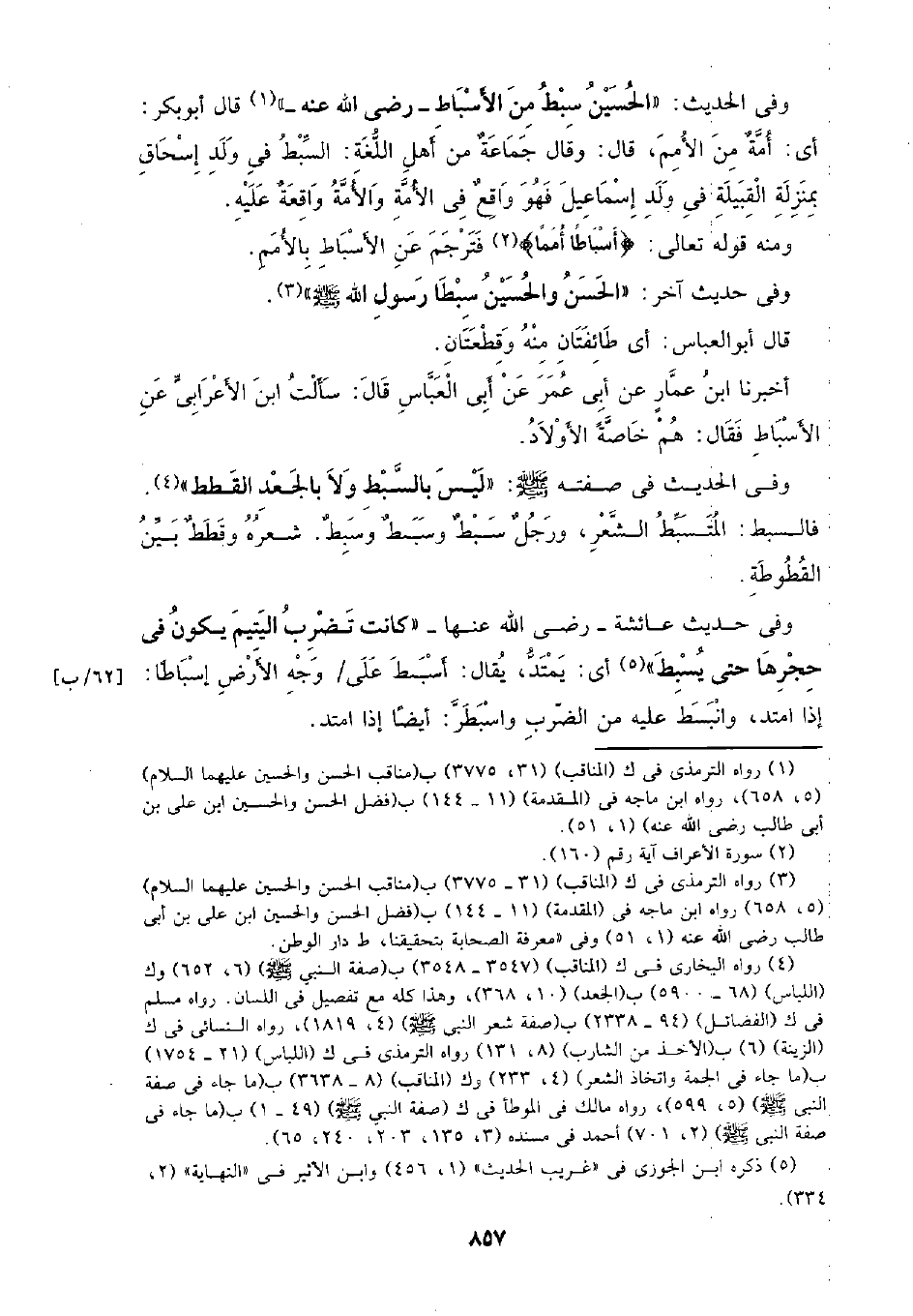 وفي الحديث: (الحسين سبط من الأسباط - رضي الله عنه -) قال أبو بكر: أي: أمة من الأمم، قال: وقال جماعة من أهل اللغة: السبط في ولد إسحاق بمنزلة القبيلة في ولد إسماعيل فهو واقع في الأمة والأمة واقعة عليه.
