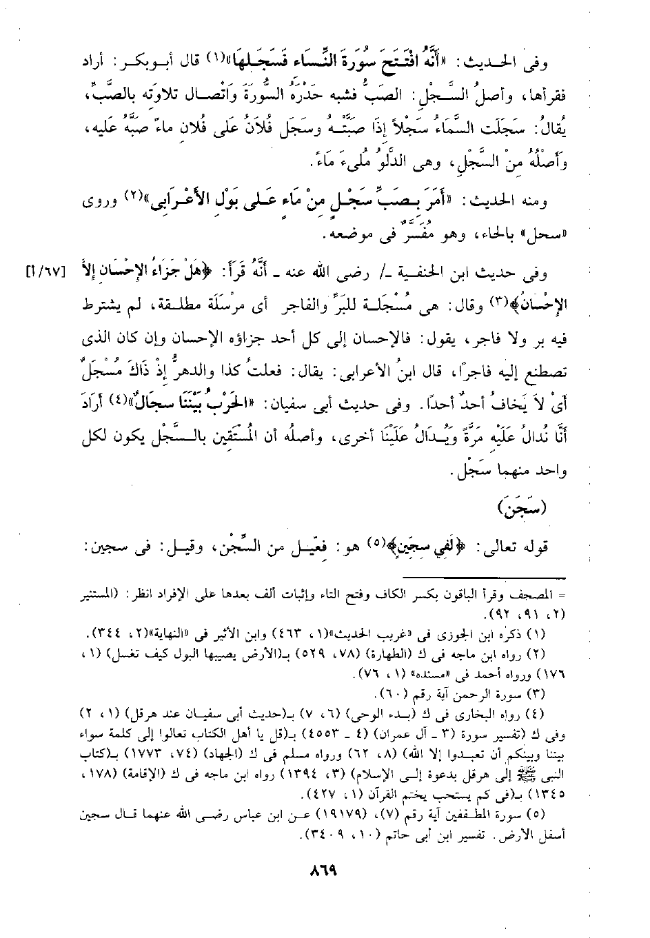 وفي حديث ابن الحنفية - رضي الله عنه - أنه قرأ: {هل جزاء الإحسان إلا الإحسان} وقال: هي مسجلة للبر والفاجر أي مرسلة مطلقة، لم يشترط فيه بر ولا فاجر، يقول: فالإحسان إلى كل أحد جزاؤه الإحسان وإن كان الذي تصطنع إليه فاجرًا، قال ابن الأعرابي: يقال: فعلت كذا والدهر إذ ذاك مسجل أي لا يخاف أحدٌ أحدًا. وفي حديث أبي سفيان: (الحرب بيننا سجال) أراد أنا ندال عليه مرة ويدال علينا أخرى، وأصله أن المتقين بالسجل يكون لكل واحد منهما سجل.