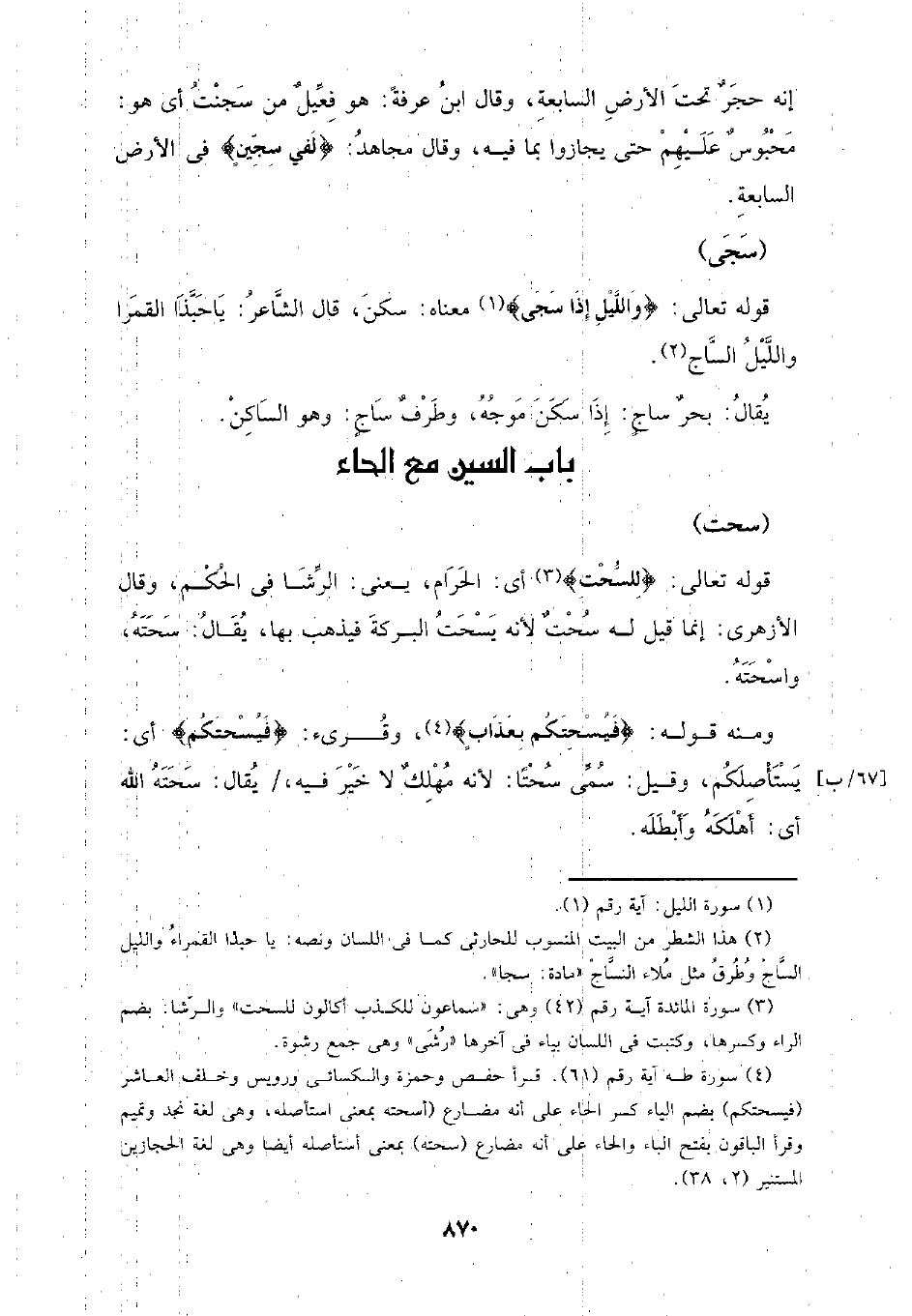 ومنه قوله: {فيسحتكم بعذاب}، وقريء: {فيسحتكم} أي: يستأصلكم، وقيل: سمي سحتًا: لأنه مهلك لا خير فيه، / يقال: سحته الله أي: أهلكه وأبطله.