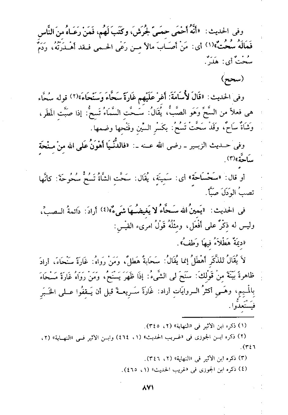 وفي الحديث: (قال لأسامة: أغر عليهم غارة سحاء وسنحاء) قوله سحاء هي فعلًا من السح وهو الصب، يقال: سحت السماء تسح: إذا صبت المطر، وشاة ساح، وقد سحت تسح: بكسر السين وفتحها وضمها.