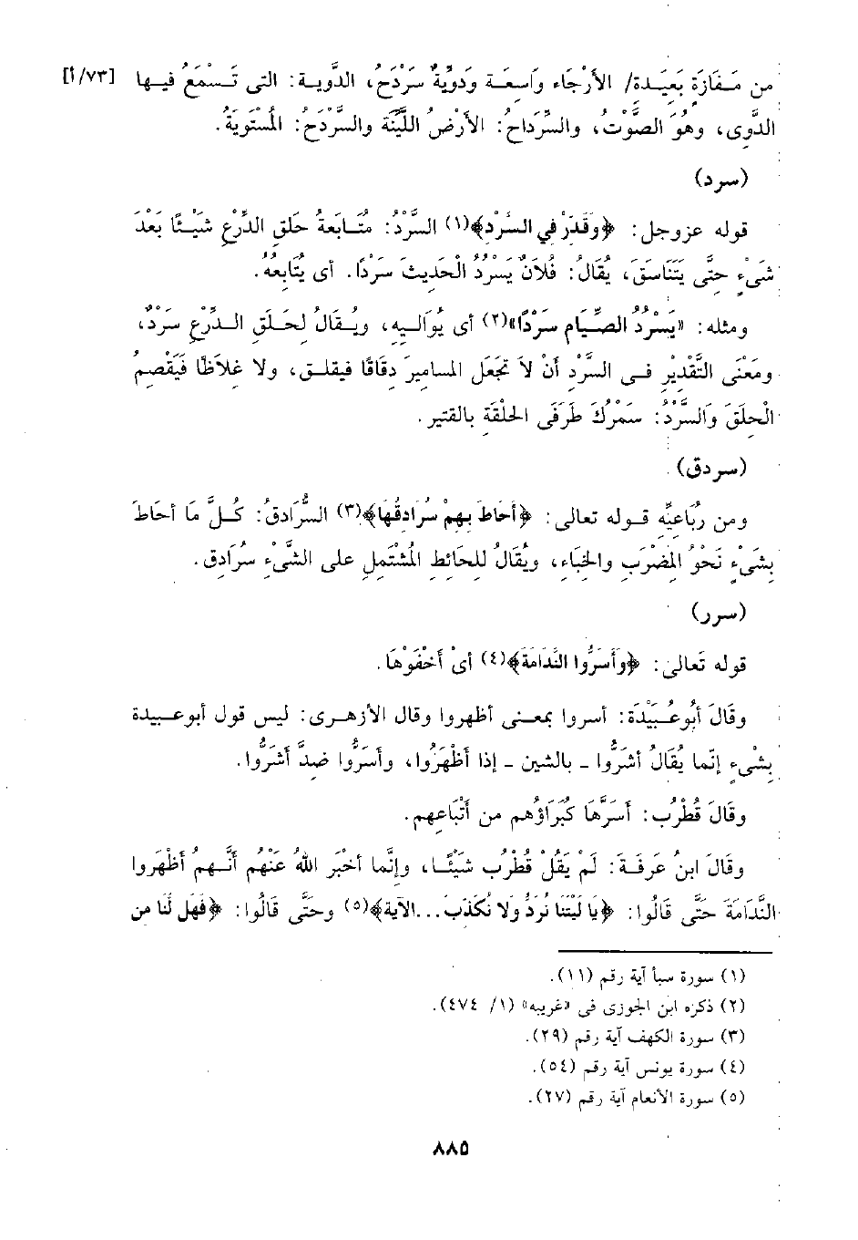 ومثله: (يسرد الصيام سردًا) أي يواليه، ويقال لحلق الدرع سرد، ومعنى التقدير في السرد أن لا تجعل المسامير دقاقًا فيقلق، ولا غلاظًا فيقصم الحلق والسرد: سمرك طرفى الحلقة بالقتير.