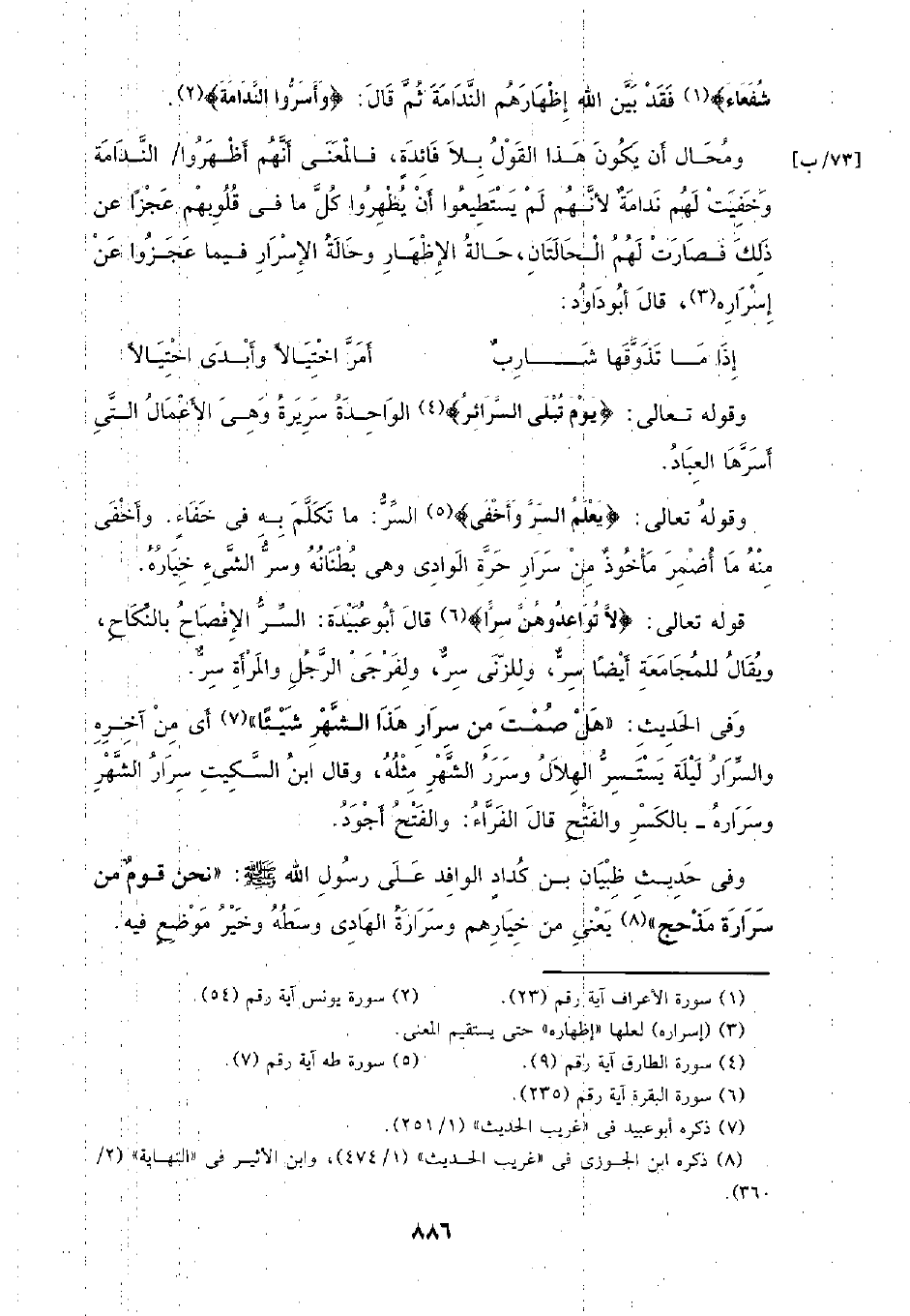 وفي الحديث: (هل صمت من سرار هذا الشهر شيئًا) أي من آخره والسرار ليلة يستسر الهلال وسرر الشهر مثله، وقال ابن السكيت سرار الشهر وسراره - بالكسر والفتح قال الفراء: والفتح أجود.