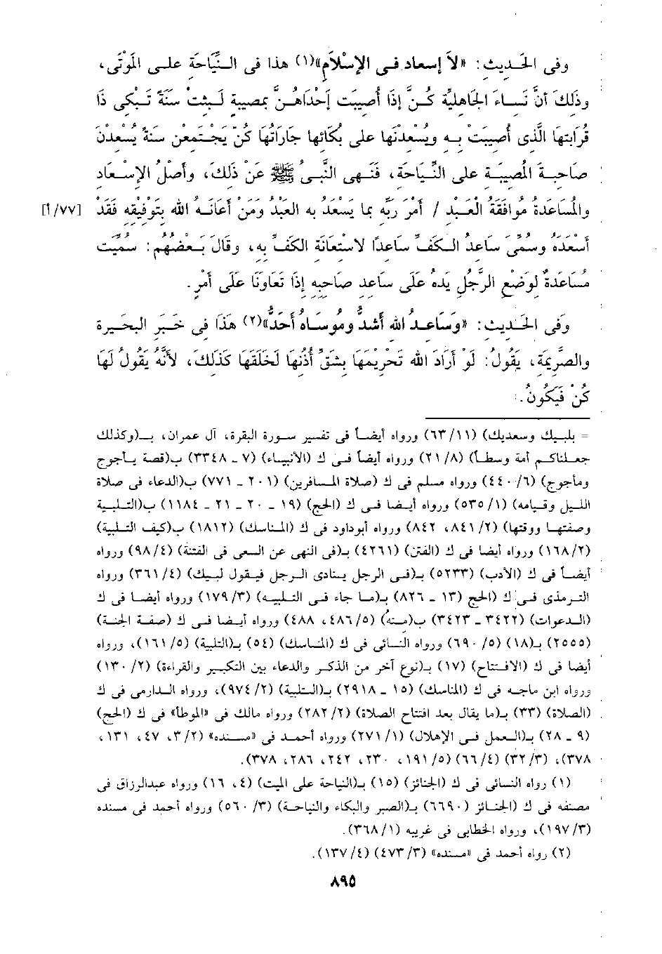 وفي الحديث: (لا إسعاد في الإسلام) هذا في النياحة على الموتى، وذلك أن نساء الجاهلية كن إذا أصيبت إحداهن بمصيبة لبثت سنة تبكي ذا قرابتها الذي أصيبت به ويسعدنها على بكائها جاراتها كن يجتمعن سنة يسعدن صاحبة المصيبة على النياحة، فنهى النبي - صلى الله عليه وسلم - عن ذلك، وأصل الإسعاد والمساعدة موافقة العبد/ أمر ربه بما يسعد به العبد ومن أعانه الله بتوفيقه فقد أسعده وسمى ساعد الكف ساعدًا لاستعانة الكف به، وقال بعضهم: سميت مساعدة لوضع الرجل يده على ساعد صاحبه إذا تعاونا على أمر.