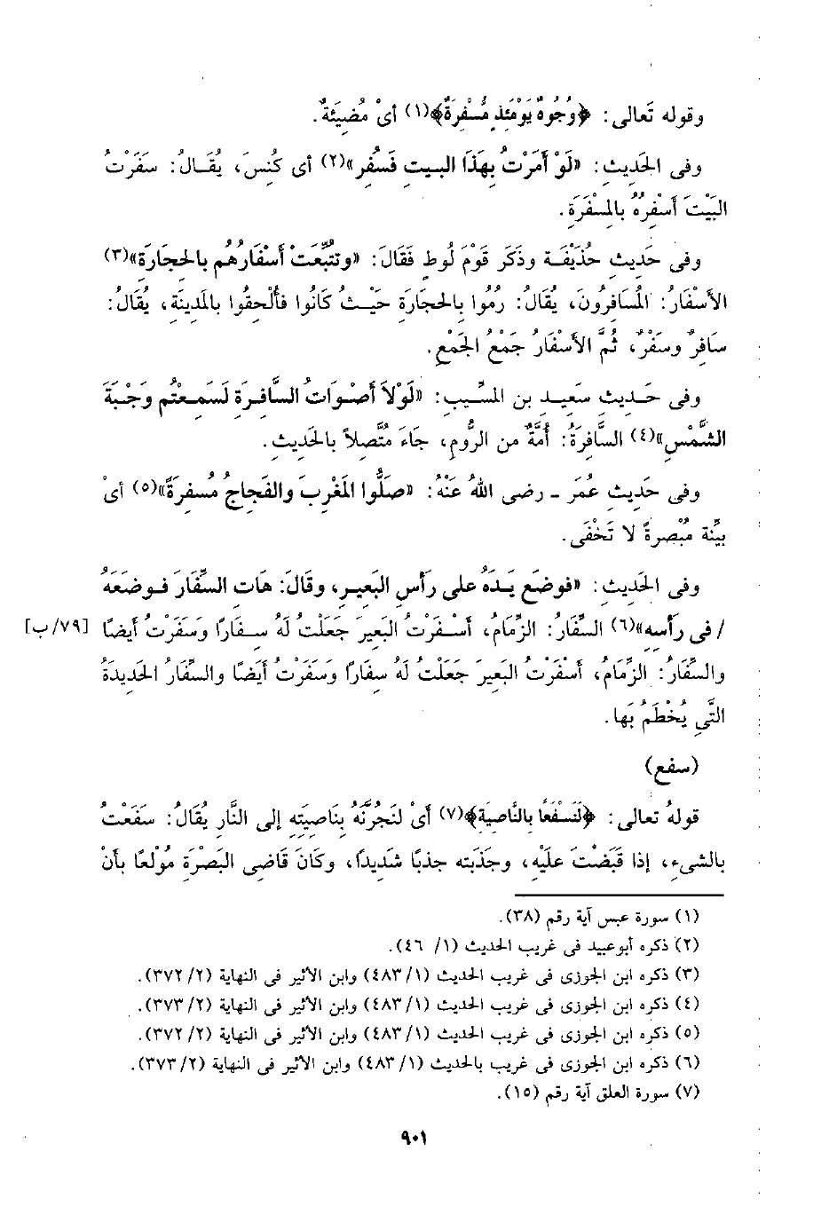 وفي حديث حذيفة وذكر قوم لوط فقال: (وتتبعت أسفارهم بالحجارة) الأسفار: المسافرون، يقال: رموا بالحجارة حيث كانوا فألحقوا بالمدينة، يقال: سافر وسفر، ثم الأسفار جمع الجمع.