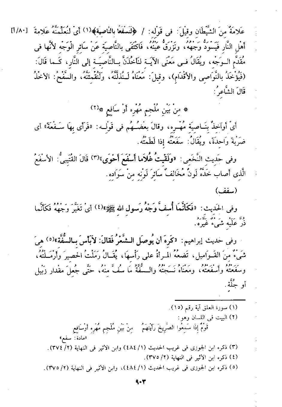 علامة من الشيطان وقيل: في قوله: /} لنسفعًا بالناصية} أي لنعلمنه علامة أهل النار فيسود وجهه، وتزرق عينه، فاكتفى بالناصية عن سائر الوجه لأنها في مقدم الوجه، ويقال في معنى الآية لنأخذن بالناصية ألى النار، كما قال: (فيؤخذ بالنواصي والأقدام)، وقيل: معناه لنذلنه، ولنقمئنه، والسفح: الأخذ قال الشاعر