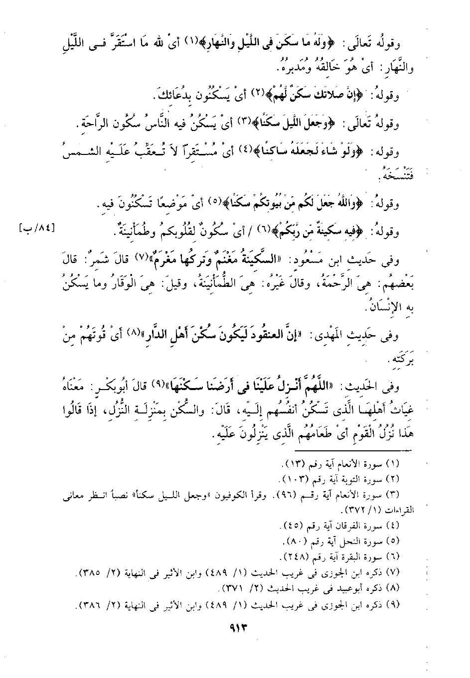 وفي حديث ابن مسعود: (السكينة مغنم وتركها مغرم) قال شمر: قال بعضهم: هي الرحمة، وقال غيره: هي الطمأنينة، وقيل: هي الوقار وما يسكن به الإنسان.