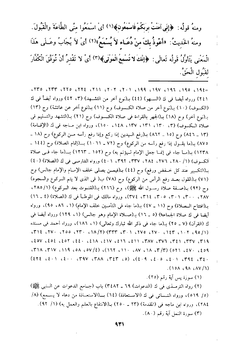 ومنه الحديث: (أعوذ بك من دعاء لا يسمع) أي لا يجاب وعلى هذا المعنى يتأول قوله تعالى: {إنك لا تسمع الموتى} أي لا تقدر أن توفق الكفار لقبول الحق.