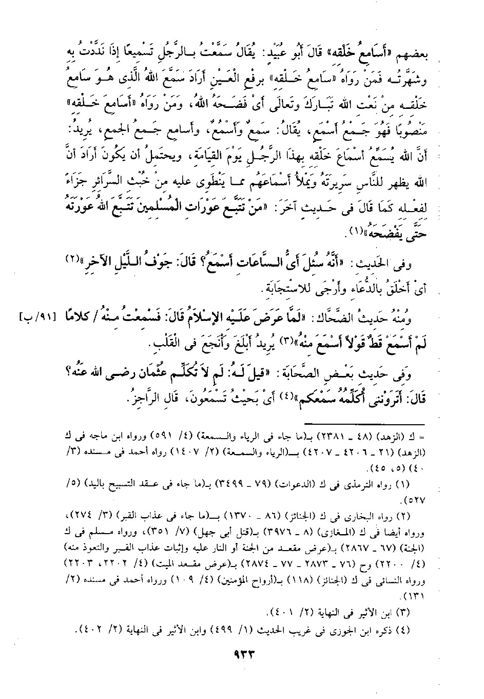 بعضهم (أسامع خلقه) قال أبو عبيد: يقال سمعت بالرجل تسميعًا إذا نددت به وشهرته فمن رواه (سامع خلقه) برفع العين أراد سمع الله الذي هو سامع خلقه من نعت الله تبارك وتعالى أي فضحه الله، ومن رواه (أسامع خلقه) منصوبًا فهو جمع أسمع، يقال: سمع وأسمع، وأسامع جمع الجمع، يريد: أن الله يسمع أسماع خلقه بهذا الرجل يوم القيامة، ويحتمل أن يكون أراد أن الله يظهر للناس سريرته ويملأ أسماعهم مما ينطوي عليه من خبث السرائر جزاء لفعله كما قال في حديث آخر: (من تتبع عورات المسلمين تتبع الله عورته حتى يفضحه).