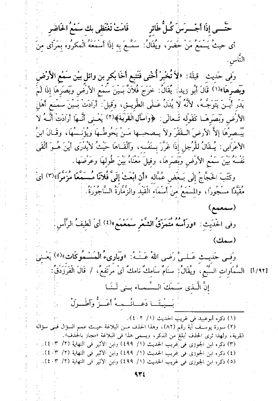 وفي حديث قيلة: (لا تخبر أختي فتتبع أخا بكر بن وائل بين سمع الأرض وبصرها) قال أبو زيد: يقال: خرج فلان بين سمع الأرض وبصرها إذا لم يدر أين يتوجه، لأنه لا يدل على الطريق، وقيل: أرادت بين سمع أهل الأرض وبصرها كقوله: {واسأل القرية} يعني أنها أرادت أنه لا يبصرها إلا الأرض القفر ولا يصحبها من يحوطها ويؤنسها، وقال ابن الأعرابي: يقال للرجل إذا غرر بنفسه، وألقاها حيث لا يدرى أين هو ألقى نفسه بين سمع الأرض وبصرها، وقيل معناه بين طولها وعرضها.