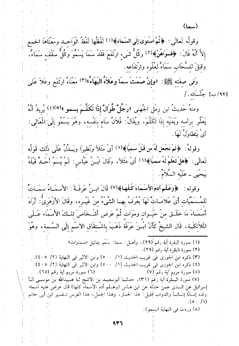 وقوله تعالى: {ثم استوى إلى السماء} لفظها لفظ الواحد ومعناها الجمع إلا أنه قال: {فسواهن} وكل شيء ارتفع فقد سما يسمو وكل سقف سماء، وقيل للسحاب سماء لعلوه وارتفاعه.