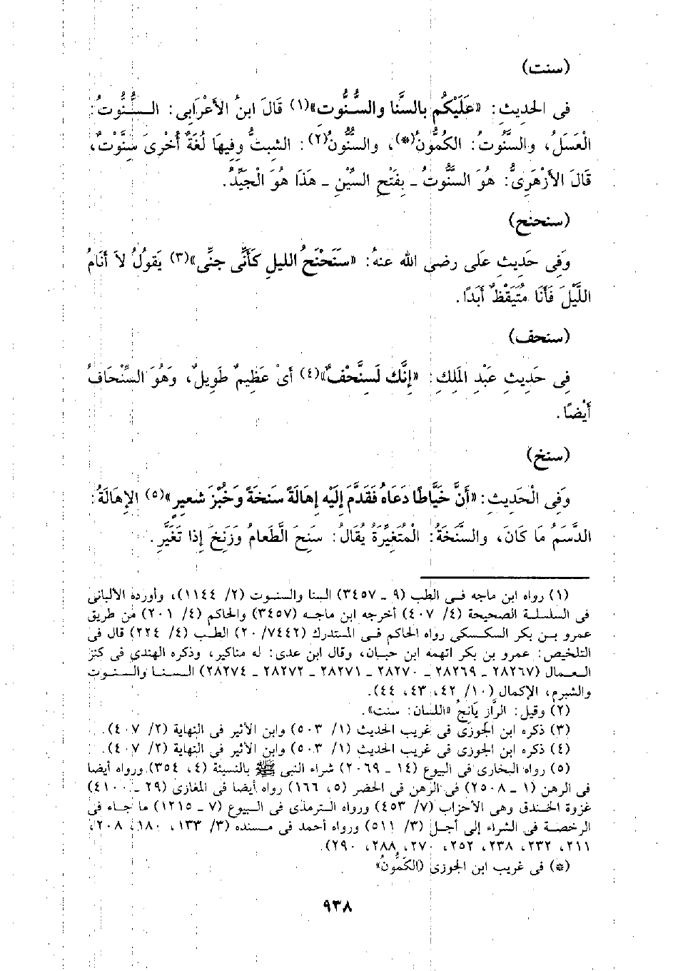 في الحديث: (عليكم بالسنا والسنوت) قال ابن الأعرابي: السنوت: العسل، والسنوت: الكمون، والسنون: الشبت وفيها لغة أخرى سنوت، قال الأزهري: هو السنوت- بفتح السين- هذا هو الجيد.