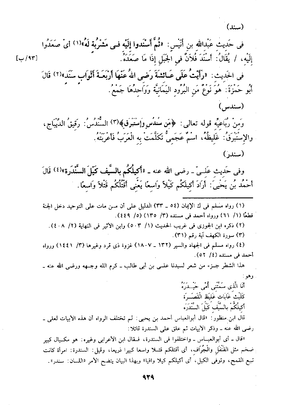 في الحديث: (رأيت على عائشة رضي الله عنها أربعة أثواب سند) قال أبو حمزة: هو نوع من البرود اليمانية وواحدها جمع.