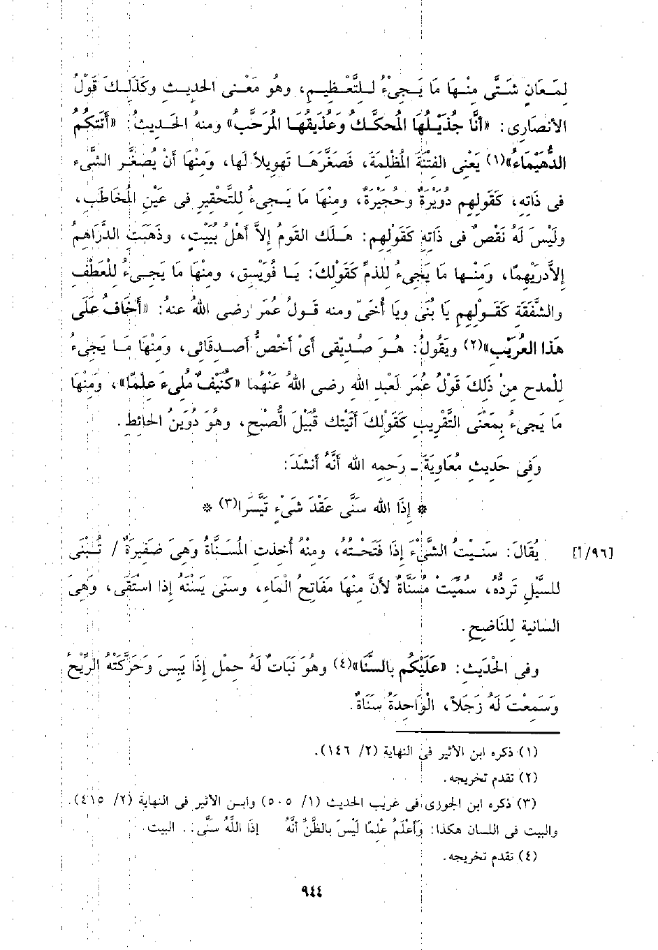 يقال: سنيت الشيء إذا فتحته، ومنه أخذت المسناة وهي ضفيرة/ تبنى للسيل ترده، سميت مسناة لأن منها مفاتح الماء، وسنى يسنه إذا استقى، وهي السانية للناضح.