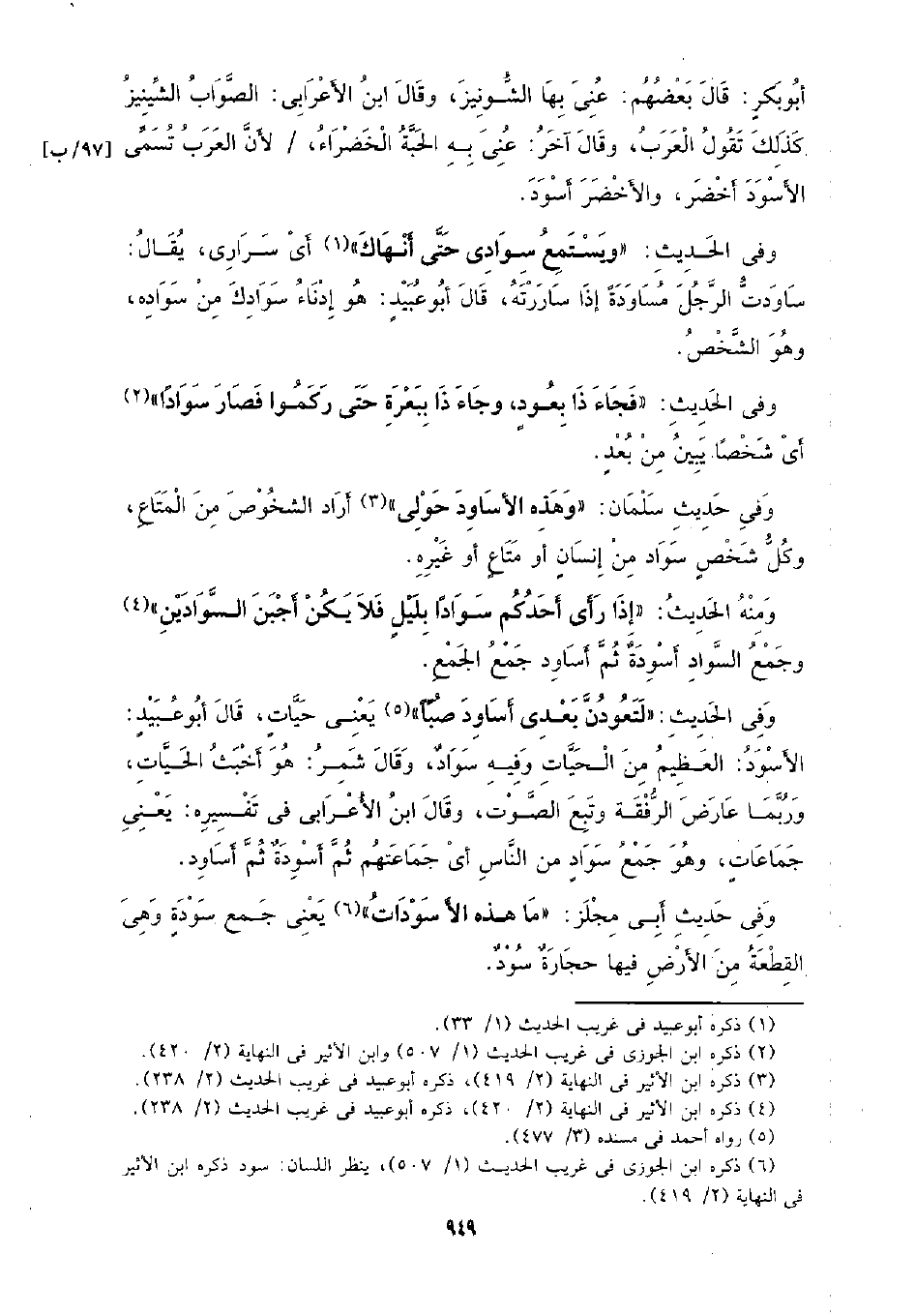 وفي الحديث: (لتعودن بعدي أساود صبًا) يعني حيات، قال أبو عبيد: الأسود: العظيم من الحيات وفيه سواد، وقال شمر: هو أخبث الحيات، وربما عارض الرفقة وتبع الصوت، وقال ابن الأعرابي في تفسيره: يعني جماعات، وهو جمع سواد من الناس أي جماعتهم ثم أسودة ثم أساود.