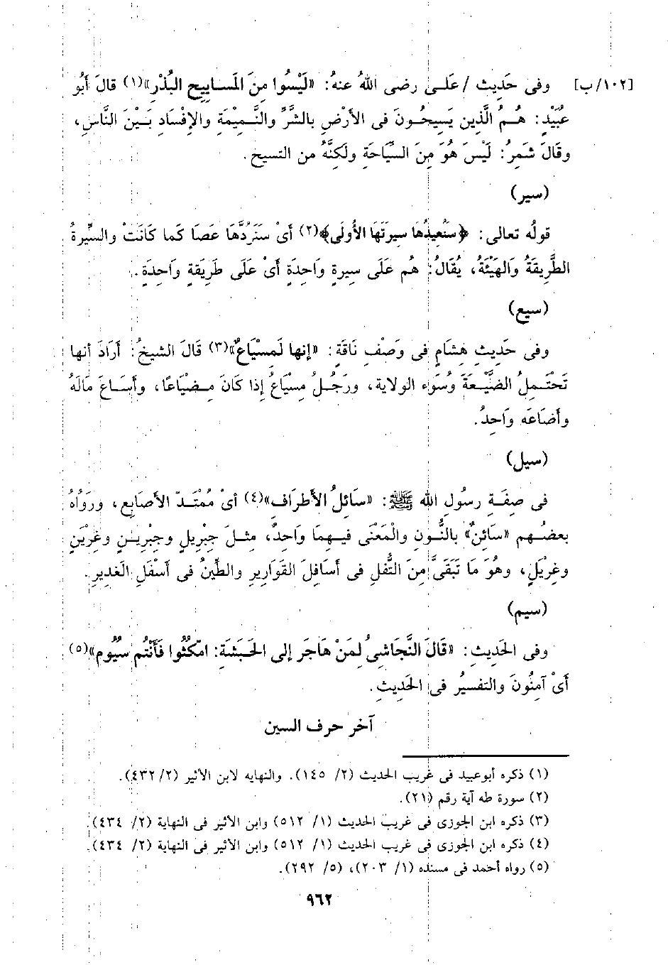 [102/ ب] وفي حديث/ علي رضي الله عنه: (ليسوا من المساييح البذر) قال أبو عبيد: هم الذين يسيحون في الأرض بالشر والنميمة والإفساد بين الناس، وقال شمر: ليس هو من السياحة ولكنه من التسيح.
