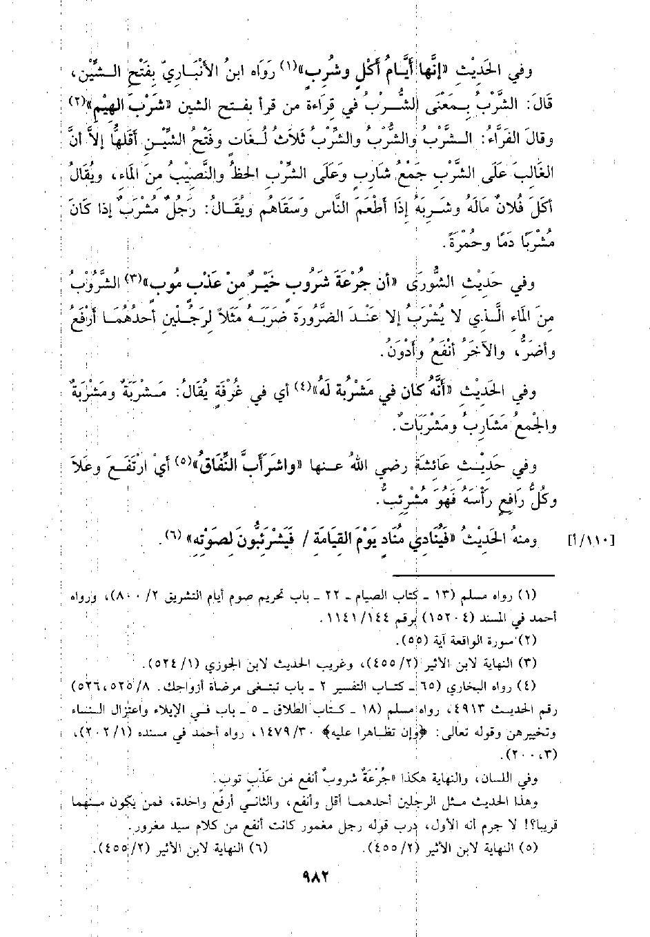 وفي الحديث (إنها أيام أكل وشرب) رواه ابن الأنباري بفتح الشين، قال: الشرب بمعنى الشرب في قراءة من قرأ بفتح الشين (شرب الهيم)