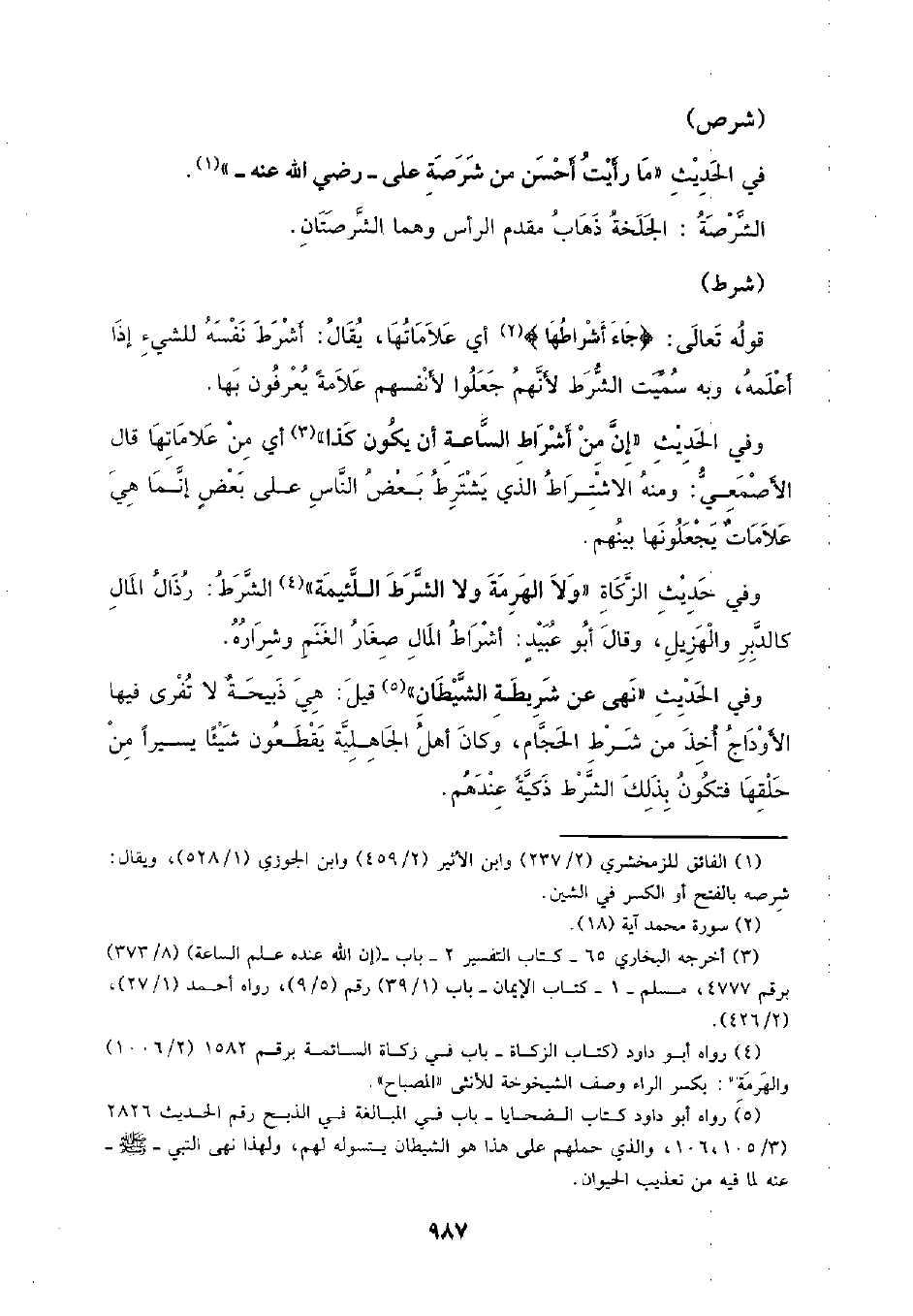 وفي حديث الزكاة (ولا الهرمة ولا الشرط اللئيمة) الشرط: رذال المال كالدبر والهزيل، وقال أبو عبيد: أشراط المال صغار الغننم وشراره.
