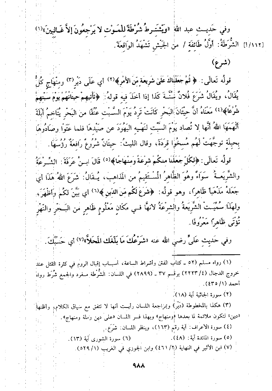 قوله تعالى: {ثم جعلناك على شريعة من الأمر} أي على دير ومنهاج كل يقال، ويقال شرع فلان سنة كذا إذا أخذ فيه قوله: {تأتيهم حيتانهم يوم سبتهم شرعًا} معناه أن حيتان البحر كانت ترد يوم السبت عنقًا من البحر يتاخم أبلة ألهمها الله أنها لا تصاد يوم السبت لنهيه اليهود عن صيدها فلما عتوا وصادوها بحيلة توجهت لهم مسخوا قردة، وقال الليث: حيتان شروع رافعة رؤسها.