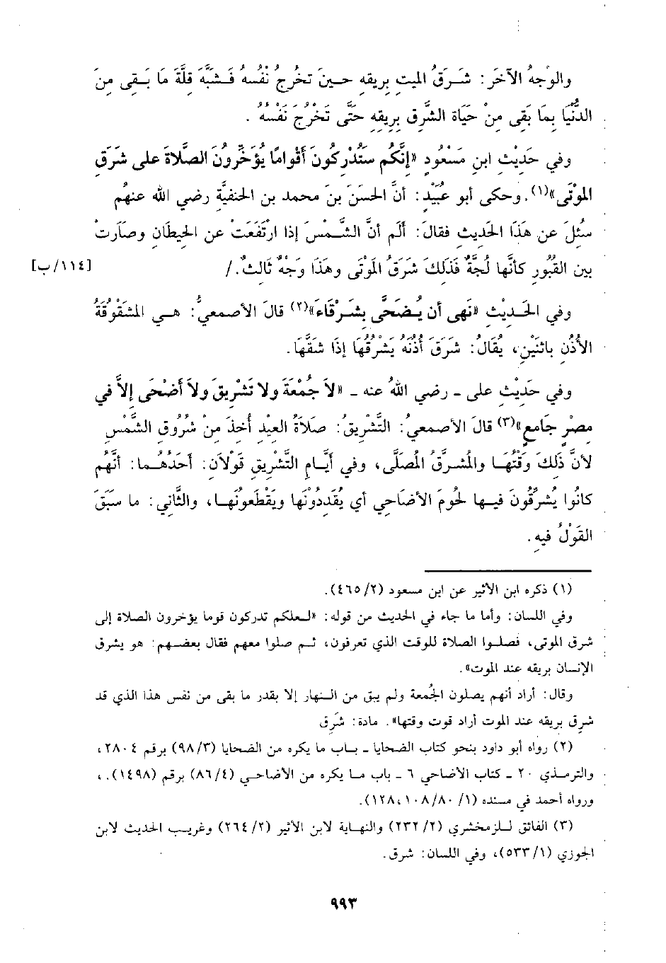 وفي حديث ابن مسعود (إنكم ستدركون أقوامًا يؤخرون الصلاة على شرق الموتى). وحكى أبو عبيد: أن الحسن بن محمد بن الحنفية رضي الله عنهم