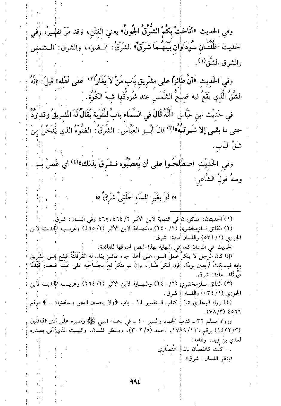 وفي الحديث (أناخت بكم الشرق الجون) يعني الفتن، وقد مر تفسيره وفي الحديث (ظلتان سوداوان بينهما شرق) الشرق: الضوء، والشرق: الشمس والشرق الشق.