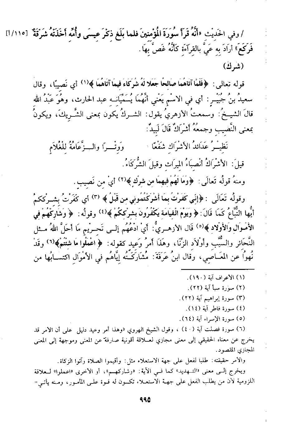 قال الشيخ: وسمعت الأزهري يقول: الشرك يكون بمعنى الشريك، ويكون بمعنى النصيب وجمعه أشراك قال لبيد: