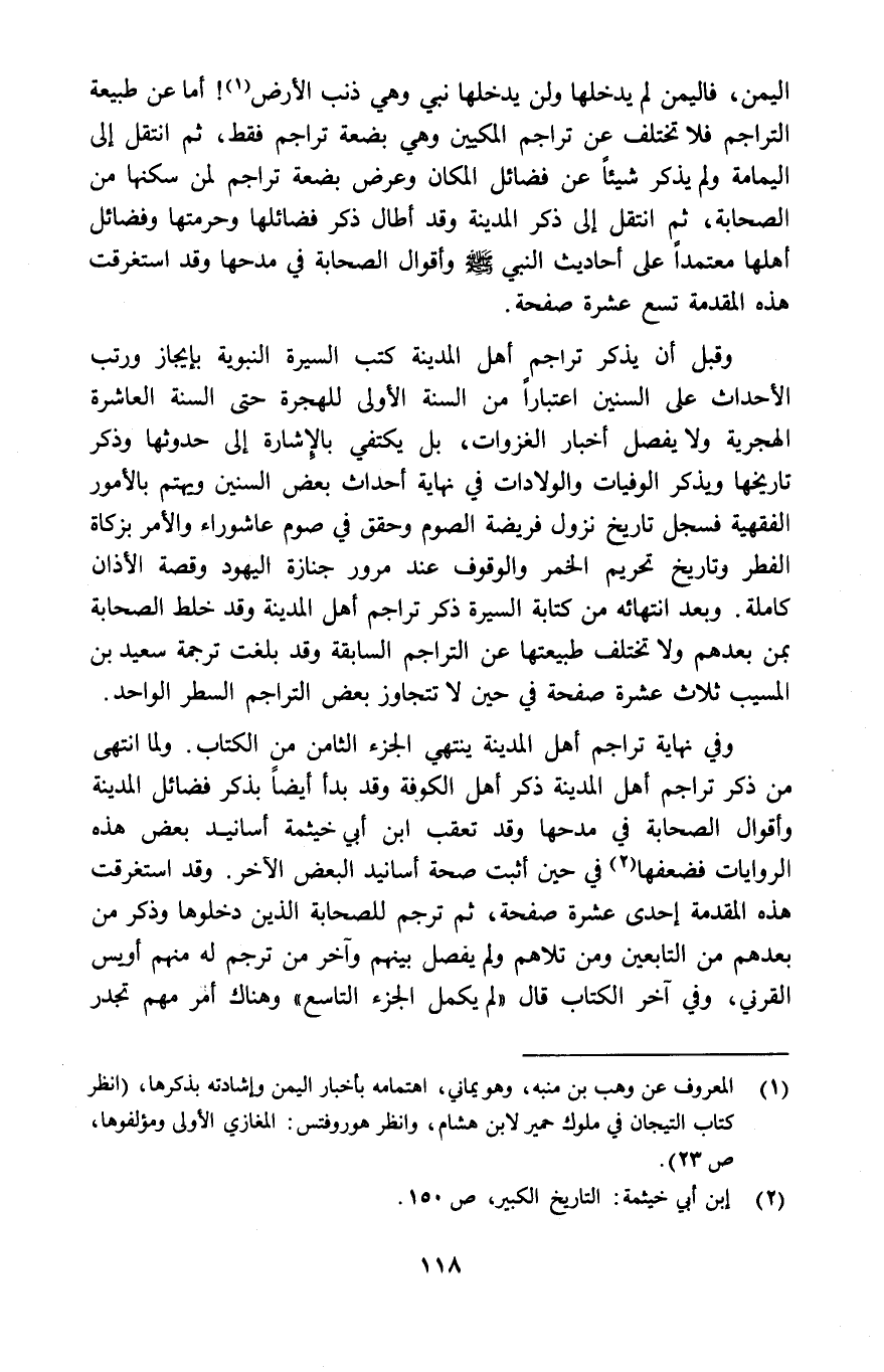 اليمن، فاليمن لم يدخلها ولن يدخلها نبي وهي ذنب الأرض1! أما عن طبيعة التراجم فلا تختلف عن تراجم المكيين وهي بضعة تراجم فقط، ثم انتقل إلى اليمامة ولم يذكر شيئا عن فضائل المكان وعرض بضعة تراجم لمن سكنها من الصحابة، ثم انتقل إلى ذكر المدينة وقد أطال ذكر فضائلها وحرمتها وفضائل أهلها معتمدا على أحاديث النبي صلى الله عليه وسلم وأقوال الصحابة في مدحها وقد استغرق هذه المقدمة تسع عشرة صفحة.