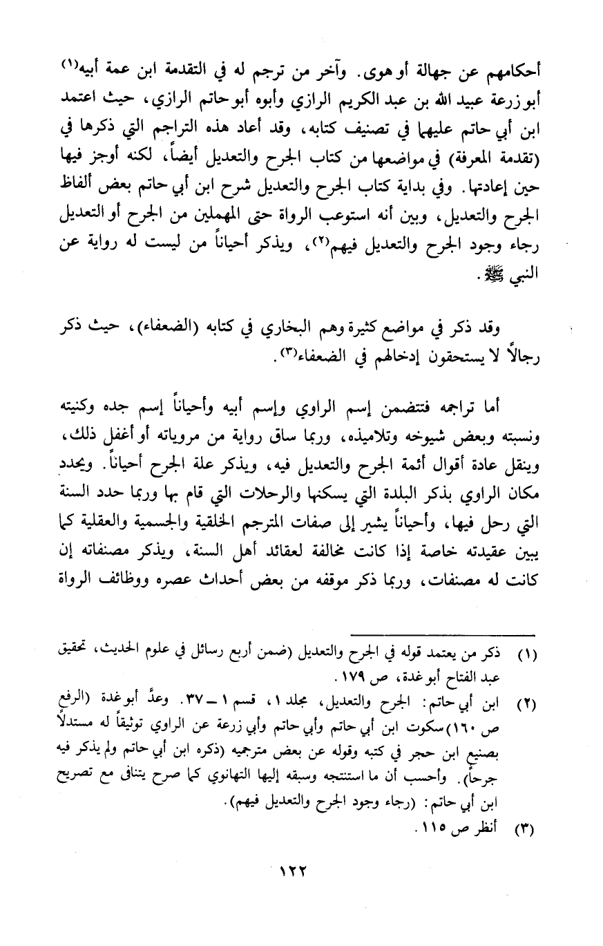 2 ابن أبي حاتم: الجرح والتعديل، مجلد1، قسم1-37. وعد أبو غدة "الرفع ص160" سكوت ابن أبي حاتم وأبي حاتم وأبي زرعة عن الراوي توثيقا له مستدلا بصنيع ابن حجر في كتبه وقوله عن بعض مترجميه "ذكره ابن أبي حاتم ولم يذكر فيه جرحا". وأحسب أن ما استنتجه وسبقه إليها التهانوي كما صرح يتنافى مع تصريح ابن أبي حاتم: "رجاء وجود الجرح والتعديل فيهم".