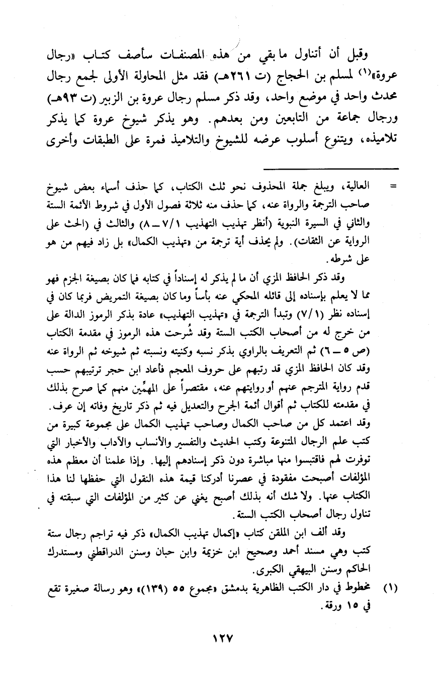 وقبل أن أتناول ما بقي من هذه المصنفات سأصف كتاب "رجال عروة"1 لمسلم بن الحجاج "ت261هـ" فقد مثل المحاولة الأولى لجمع رجال محدث واحد في موضع واحد، وقد ذكر مسلم رجال عروة بن الزبير "ت93هـ" ورجال جماعة من التابعين ومن بعدهم. وهو يذكر شيوخ عروة كما يذكر تلاميذه، ويتنوع أسلوب عرضه للشيوخ والتلاميذ فمرة على الطبقات وأخرى.