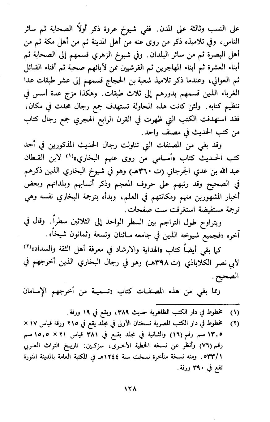 على النسب وثالثة على المدن. ففي شيوخ عروة ذكر أولا الصحابة ثم سائر الناس، وفي تلاميذه ذكر من روى عنه من أهل المدينة ثم من أهل مكة ثم من أهل البصرة ثم من سائر البلدان. وفي شيوخ الزهري قسمهم إلى الصحابة ثم ابناء العشرة ثم ابناء المهاجرين ثم القرشيين ممن لآبائهم صحبة ثم أفناء القبائل ثم العوالي، وعندما ذكر تلاميذ شعبة بن الحجاج قسمهم إلى عشر طبقات عدا الغرباء الذين قسمهم بدورهم إلى ثلاث طبقات. وهكذا مزج عدة أسس في تنظيم كتابه. ولئن كانت هذه المحاولة تستهدف جمع رجال محدث في مكان، فقد استهدفت الكتب التي ظهرت في القرن الرابع الهجري جمع رجال كتاب من كتب الحديث في مصنف واحد.