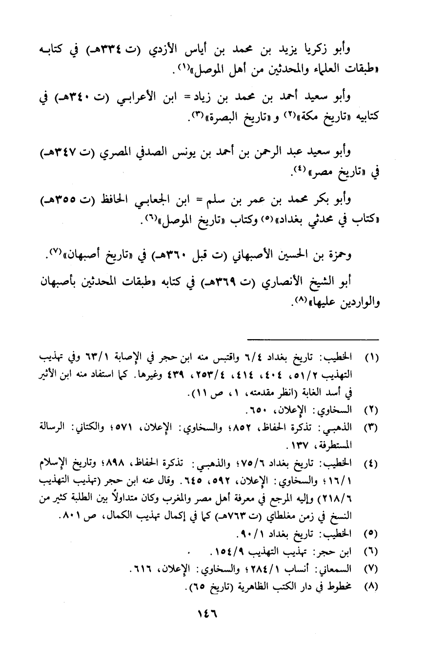1 الخطيب: تاريخ بغداد 4/ 6 واقتبس منه ابن حجر في الإصابة 1/ 63 وفي تهذيب التهذيب 2/ 51، 404، 414، 4/ 253، 439 وغيرها. كما استفاد منه ابن الأثير في أسد الغابة "انظر مقدمته، 1، ص11".