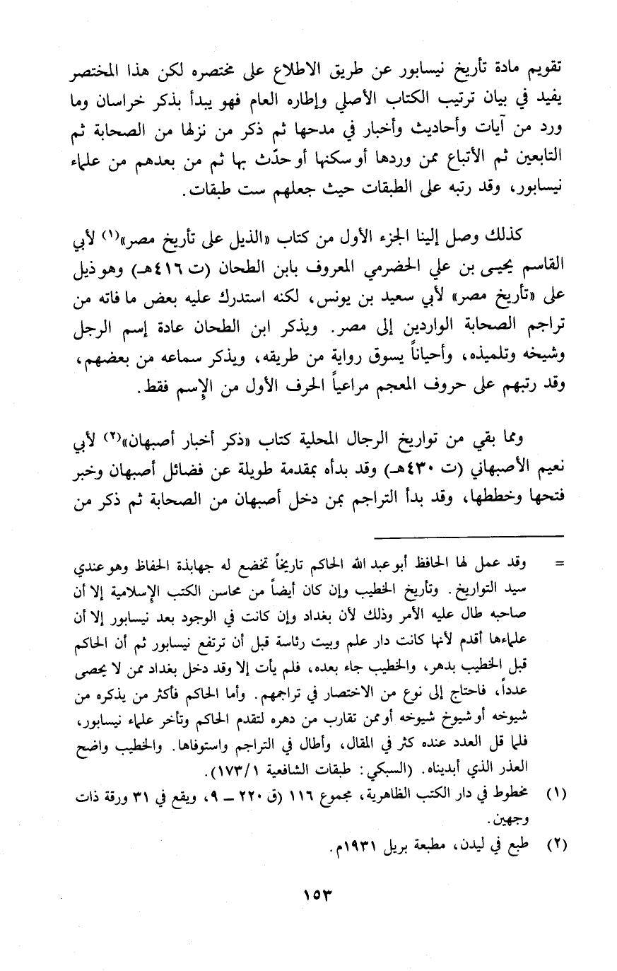 = وقد عمل لها الحافظ أبو عبد الله الحاكم تاريخا تخضع له جابذة الحفاظ وهو عندي سيد التواريخ. وتأريخ الخطيب وإن كان أيضا من محاسن الكتب الإسلامية إلا أن صاحبه طال عليه الأمر وذلك لأن بغداد وإن كانت في الوجود بعد نيسابور إلا أن علماءها أقدم لأنها كانت دار علم وبيت رئاسة قبل أن ترتفع نيسابور ثم أن الحاكم قبل الخطيب بدهر، والخطيب جاء بعده، فلم يأت إلا وقد دخل بغداد ممن لا يحصى شيوخه أو شيوخ شيوخه أو ممن تقارب من دهره لتقدم الحاكم وتأخر علماء نيسابور، فلما قل العدد عنده كثر في المقال، وأطال في التراجم واستوفاها. والخطيب واضح العذر الذي أبديناه. "السبكي: طبقات الشافعية 1/ 173".