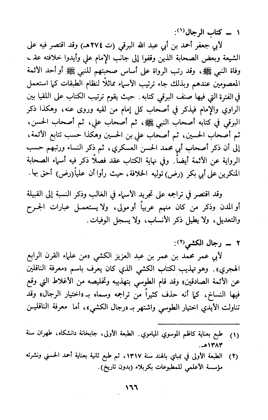 لأبي جعفر أحمد بن أبي عبد الله البرقي "ت274هـ" وقد اقتصر فيه على الشيعة وبضع الصحابة الذين وقفوا إلى جانب الإمام علي وأيدوا خلافته عقب وفاة النبي صلى الله عليه وسلم، وقد رتب الرواة على أساس صحبتهم للنبي صلى الله عليه وسلم أو أحد الأئمة المعصومين عندهم وبذلك جاء ترتيب الأسماء مماثلا لنظام الطبقات كما استعمل في الفترة التي فيها صنف البرقي كتابه. حيث يقوم ترتيب الكتاب على اللقيا بين الراوي والإمام فيذكر في أصحاب كل إمام من لقيه وروى عنه، وهكذا ذكر البرقي في كتابه أصحاب النبي صلى الله عليه وسلم، ثم أصحاب علي، ثم أصحاب الحسن، ثم أصحاب الحسين، ثم أصحاب علي بن الحسين وهكذا حسب تتابع الأئمة، إلى أن ذكر أصحاب أبي محمد الحسن العسكري, ثم ذكر النساء ورتبهم حسب الرواية عن الأئمة أيضا. وفي نهاية الكتاب عقد فصلا ذكر فيه أسماء الصحابة المنكرين على أبي بكر رضي الله عنه توليه الخلافة، حيث رأوا أن عليا رضي الله عنه أحق بها.