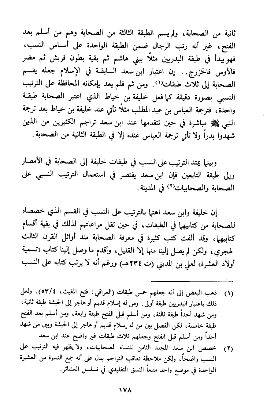ثانية من الصحابة, ولم يسم الطبقة الثالثة من الصحابة وهم من أسلم بعد الفتح، غير أنه رتب الرجال ضمن الطبقة الواحدة على اساس النسب، فهو يبدأ في طبقة البدريين مثلا ببني هاشم ثم بقية بطون قريش ثم مضر فالأوس فالخزرج.. إن اعتبار ابن سعد السابقة في الإسلام جعله يقسم الصحابة إلى ثلاث طبقات1. ومن ثم فلم يعد بإمكانه المحافظة على الترتيب النسبي بصورة دقيقة كما فعل خليفة بن خياط الذي اعتبر الصحابة طبقة واحدة، فترجمة العباس بن عبد المطلب مثلا تأتي عند خليفة بن خياط بعد ترجمة النبي صلى الله عليه وسلم مباشرة في حين تتقدمها عند ابن سعد تراجم الكثيرين من الذين شهدوا بدرا ولا تأتي ترجمة العباس عنده إلا في الطبقة الثانية من الصحابة.