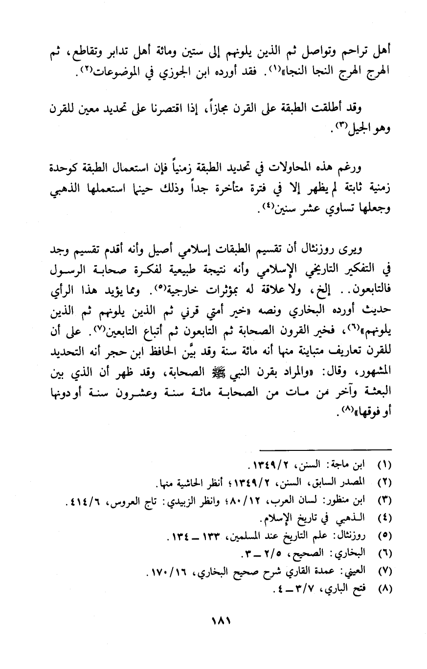 ويرى روزنثال أن تقسم الطبقات إسلامي أصيل وأنه أقدم تقسيم وجد في التفكير التاريخي الإسلامي وأنه نتيجة طبيعة لفكرة صحابة الرسول فالتابعون ... إلخ، ولا علاقة له بمؤثرات خارجية5. ومما يؤيد هذا الرأي حديث أورده البخاري ونصه "خير أمتي قرني ثم الذين يلونهم ثم الذين يلونهم"6، فخير القرون الصحابة ثم التابعون ثم أتباع التابعين7. على أن للقرن تعاريف متباينة منها أنه مائة سنة وقد بين الحافظ ابن حجر أنه التحديد المشهور، وقال: "والمراد بقرن النبي صلى الله عليه وسلم الصحابة، وقد ظهر أن الذي بين البعثة وآخر من مات من الصحابة مائة سنة وعشرون سنة أو دونها أو فوقها"8.