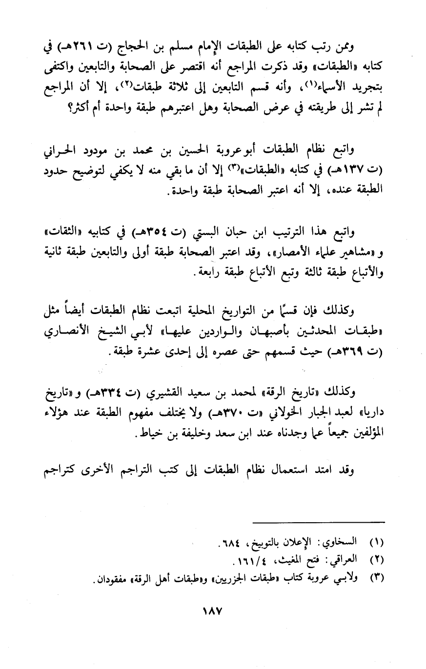 وكذلك "تاريخ الرقة" لمحمد بن سعيد القشيري "ت334هـ" و"تاريخ داريا" لعبد الجبار الخولاني "ت370هـ" ولا يختلف مفهوم الطبقة عند هؤلاء المؤلفين جميعا علما وجدناه عند ابن سعد وخليفة بن خياط.