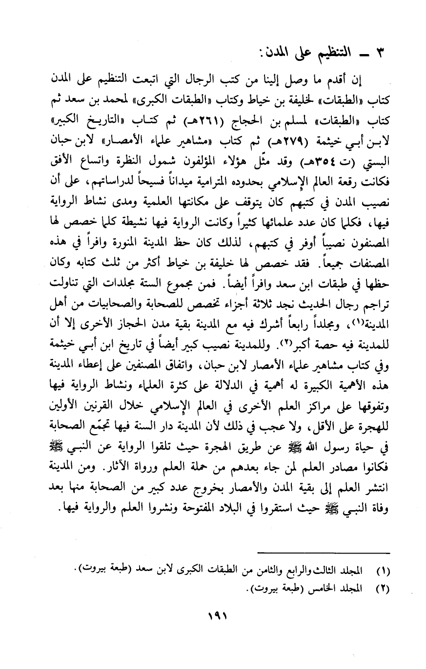 إن أقدم ما وصل إلينا من كتب الرجال التي اتبعت التنظيم على المدن كتاب "الطبقات" لخليفة بن خياط وكتاب "الطبقات الكبرى" لمحمد بن سعد ثم كتاب "الطبقات" لمسلم بن الحجاج "261هـ" ثم كتاب "التاريخ الكبير" لابن أبي خيثمة "279هـ" ثم كتاب "مشاهير علماء الأمصار" لابن حبان البستي "ت354هـ" وقد مثل هؤلاء المؤلفون شمول النظرة واتساع الأفق فكانت رقعة العالم الإسلامي بحدوده المترامية ميدانا فسيحا لدراساتهم، على أن نصيب المدن في كتبهم كان يتوقف على مكانتها العلمية ومدى نشاط الرواية فيها، فكلما كان عدد علمائها كثيرا وكانت الرواية فيها نشيطة كلما خصص لا المصنفون نصيبا أوفر في كتبهم، لذلك كان حظ المدينة المنورة وافرا في هذه المصنفات جميعا. فقد خصص لها خليفة بن خياط أكثر من ثلث كتابه وكان حظها في طبقات ابن سعد وافرا أيضا. فمن مجموع الستة مجلدات التي تناولت تراجم رجال الحديث نجد ثلاثة أجزاء تخصص للصحابة والصحابيات من أهل المدينة1، ومجلدا رابعا أشرك فيه مع المدينة بقية مدن الحجاز الأخرى إلا أن للمدينة فيه حصة أكبر2. وللمدينة نصيب كبير أيضا في تاريخ ابن أبي خيثمة وفي كتاب مشاهير علماء الأمصار لابن حبان، واتفاق المصنفين على إعطاء المدينة هذه الأهمية الكبيرة له أهمية في الدلالة على كثرة العلماء ونشاط الرواية فيها وتفوقها على مراكز لعلم الأخرى في العالم الإسلامي خلال القرنين الأولين للهجرة على الأقل, ولا عجب في ذلك لأن المدينة دار السنة فيها تجمع الصحابة في حياة رسول الله صلى الله عليه وسلم عن طريق الهجرة حيث تلقوا الرواية عن النبي صلى الله عليه وسلم فكانوا مصادر العلم لمن جاء بعدهم من حملة العلم ورواة الآثار. ومن المدينة انتشر العلم إلى بقية المدن والأمصار بخروج عدد كبير من الصحابة منها بعد وفاة النبي صلى الله عليه وسلم حيث استقروا في البلاد المفتوحة ونشروا العلم والرواية فيها.
