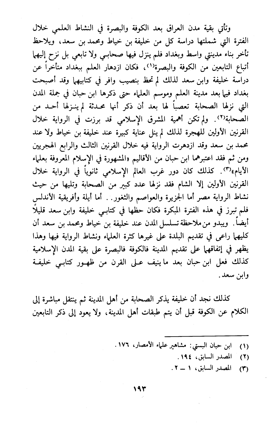 وتأتي بقية مدن العراق بعد الكوفة والبصرة في النشاط العلمي خلال الفترة التي شملتها دراسة كل من خليفة بن خياط ومحمد بن سعد، ويلاحظ تأخر بناء مدينتي واسط وبغداد فلم ينزل فيها صحابي ولا تابعي بل نزح إليهما أتبع التابعين من الكوفة والبصرة1، فكان إزدهار العلم ببغداد متأخرا عن دراسة خليفة وابن سعد لذلك لم تحظ بنصيب وافر في كتابيهما وقد أصبحت بغداد فيما بعد مدينة العلم وموسم العلماء حتى ذكرها ابن حبان في جملة المدن التي نزلها الصحابة تعصبا لها بعد أن ذكر أنها محدثة لم ينزلها أحد من الصحابة2. ولم تكن أهمية المشرق الإسلامي قد برزت في الرواية خلال القرنين الأولين للهجرة لذلك لم ينل عناية كبيرة عند خليفة بن خياط ولا عند محمد بن سعد وقد ازدهرت الرواية فيه خلال القرنين الثالث والرابع الهجريين ومن ثم فقد اعتبرهما ابن حبان من الأقاليم "المشهورة في الإسلام المعروفة بعلماء الأيام"3. كذلك كان دور غرب العالم الإسلامي ثانويا في الرواية خلال القرنين الأولين إلا الشام فقد نزلها عدد كبير من الصحابة وتليها من حيث نشاط الرواية مصر أما الجزيرة والعواصم والثغور.. أما أيلة وأفريقية الأندلس فلم تبرز في هذه الفترة المبكرة فكان حظها في كتابي خليفة وابن سعد قليلا أيضا. ويبدو من ملاحظة تسلسل المدن عند خليفة بن خياط ومحمد بن سعد أن كليهما راعى في تقديم البلدة على غيرها كثرة العلماء ونشاط الرواية فيها وهذا يظهر في إتفاهما على تقديم المدينة فالكوفة فالبصرة على بقية المدن الإسلامية كذلك فعل ابن حبان بعد ما ينيف على القرن من ظهور كتابي خليفة وابن سعد.