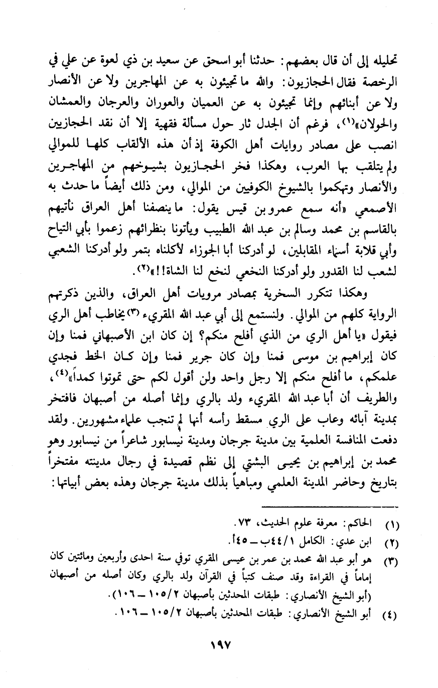 وهكذا تتكرر السخرية بمصادر مرويات أهل العراق، والذين ذكرتهم الرواية كلهم من الموالي. ولنستمع إلى أبي عبد الله المقرئ3 يخاطب أهل الري فيقول "يا أهل الري من الذي أفلح منكم؟ إن كان ابن الأصبهاني فمنا وإن كان إبراهيم بن موسى قمنا وإن كان جرير فمنا وإن كان الخط فجدي علمكم، ما أفلح منكم إلا رجل واحد ولن أقول لكم حتى تموتوا كمدا"4.