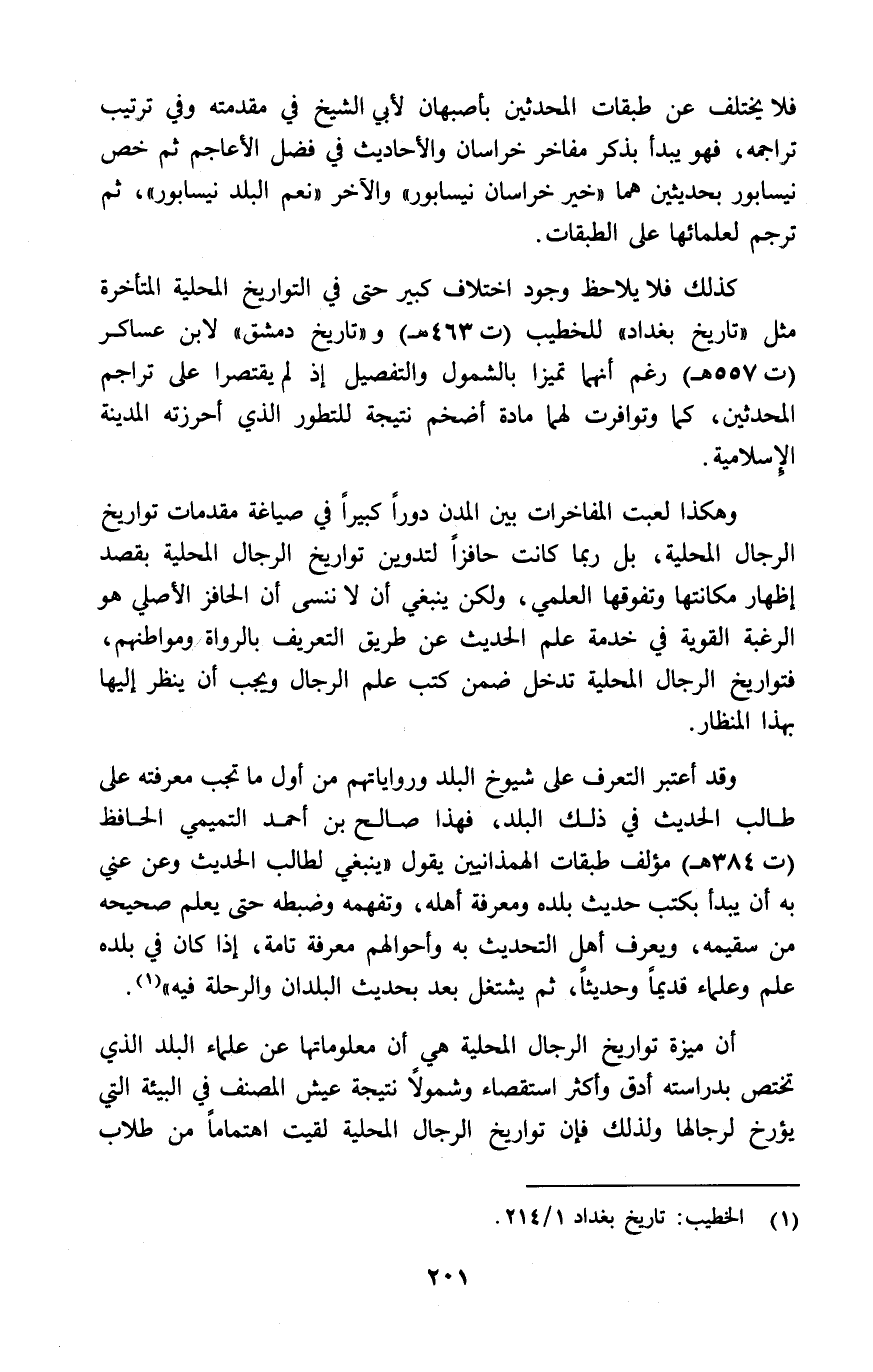 كذلك فلا يلاحظ وجود اختلاف كبير حتى في التواريخ المحلية المتأخرة مثل "تاريخ بغداد" للخطيب "ت463هـ" و"تاريخ دمشق" لابن عساكر "ت557هـ" رغم أنهما تميزا بالشمول والتفصيل إذ لم يقتصرا على تراجم المحدثين، كما وتوافرت لهما مادة أضخم نتيجة للتطور الذي أحرزته المدينة الإسلامية.