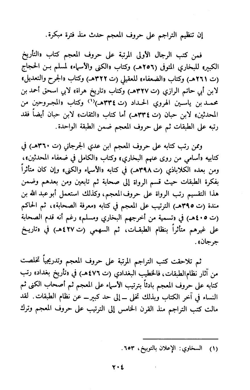 وممن رتب كتابه على حروف المعجم ابن عدي الجرجاني "ت360هـ" في كتابيه "أسامي من روى عنهم البخاري" وكتاب "الكامل في ضعفاء المحدثين"، ومن بعد الكلاباذي "ت398هـ" في كتابه "الأسماء والكنى" وإن كان متأثرا بفكرة الطبقات حيث قسم الرواة إلى صحابة ثم تابعين ومن بعدهم وضمن هذا التقسيم رتب الرواة على حروف المعجم، وكذلك استعمل أبو عبد الله بن مندة "ت395هـ" الترتيب على المعجم في كتابه "معرفة الصحابة"، ثم الحاكم "ت405هـ" في "تسمية من أخرجهم البخاري ومسلم" رغم أنه قدم الصحابة على غيرهم متأثرا بنظام الطبقات، ثم السهمي "ت427هـ" في "تاريخ جرجان".