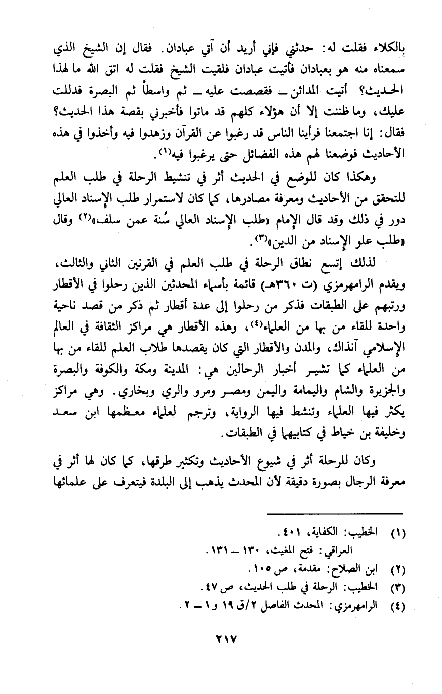 لذلك إتسع نطاق الرحلة في طلب العلم في القرنين الثاني والثالث، ويقدم الرامهرمزي "ت360هـ" قائمة بأسماء المحدثين الذين رحلوا في الأقطار ورتبهم على الطبقات فذكر من رحلوا إلى عدة أقطار ثم ذكر من قصد ناحية واحدة للقاء من بها من العلماء4، وهذه الأقطار هي مراكز الثقافة في العالم الإسلامي آنذاك، والمدن والأقطار التي كان يقصدها طلاب العلم للقاء من بها من العلماء كما تشير أخبار الرحالين هي: المدينة ومكة والكوفة والبصرة والجزيرة والشام واليمامة واليمن ومصر ومرو والري وبخاري. وهي مراكز يكثر فيها العلماء وتنشط فيها الرواية، وترجم لعلماء معظمها ابن سعد وخليفة بن خياط في كتابيهما في الطبقات.
