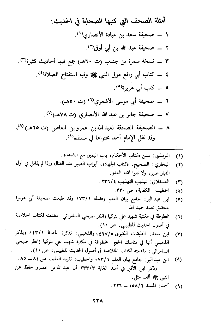 8- الصحيفة الصادقة لعبد الله بن عمرو بن العاص "ت65هـ"8، وقد نقل الإمام أحمد محتواها في مسنده9.