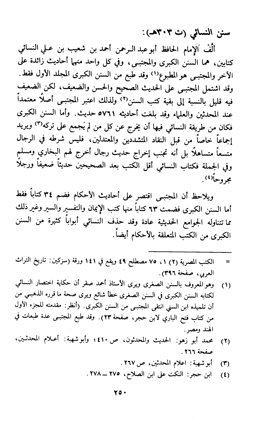 1 وهو المعروف بالسنن الصغرى ويرى الأستاذ أحمد صقر أن حكاية اختصار النسائي لكتابه السنن الكبرى في السنن الصغرى خطأ شائع ويرى صحة ما قرره الذهبي من أن تلميذه ابن السني انتقى المجتبى من السنن الكبرى. "انظر: مقدمته للجزء الأول من كتاب فتح الباري لابن حجر، صفحة 23". وقد طبع المجتبى عدة طبعات في الهند ومصر.