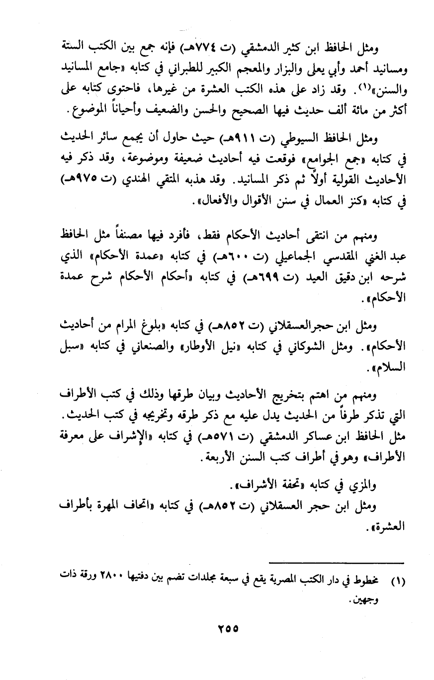 ومثل الحافظ ابن كثير الدمشقي "ت774هـ" فإنه جمع بين الكتب الستة ومسانيد أحمد وأبي يعلى والبزار والمعجم الكبير للطبراني في كتابه "جامع المسانيد والسنن"1. وقد زاد على هذه الكتب العشرة من غيرها، فاحتوى كتابه على أكثر من مائة ألف حديث فيها الصحيح والحسن والضعيف وأحيانا الموضوع.