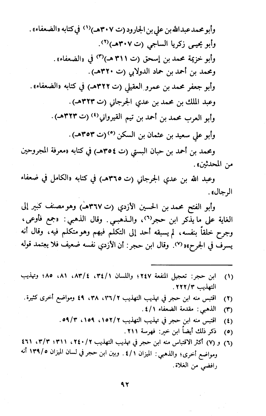 وأبو الفتح محمد بن الحسين الأزدي "ت367هـ" وهو مصنف كبير إلى الغاية على ما يذكر ابن حجر6، والذهبي. وقال الذهبي: "جمع فأوعى، وجرح خلقا بنفسه، لم يسبقه أحد إلى التكلم فيهم وهو متكلم فيه، وقال أنه يسرف في الجرح"7. وقال ابن حجر: أن الأزدي نفسه ضعيف فلا يعتمد قوله