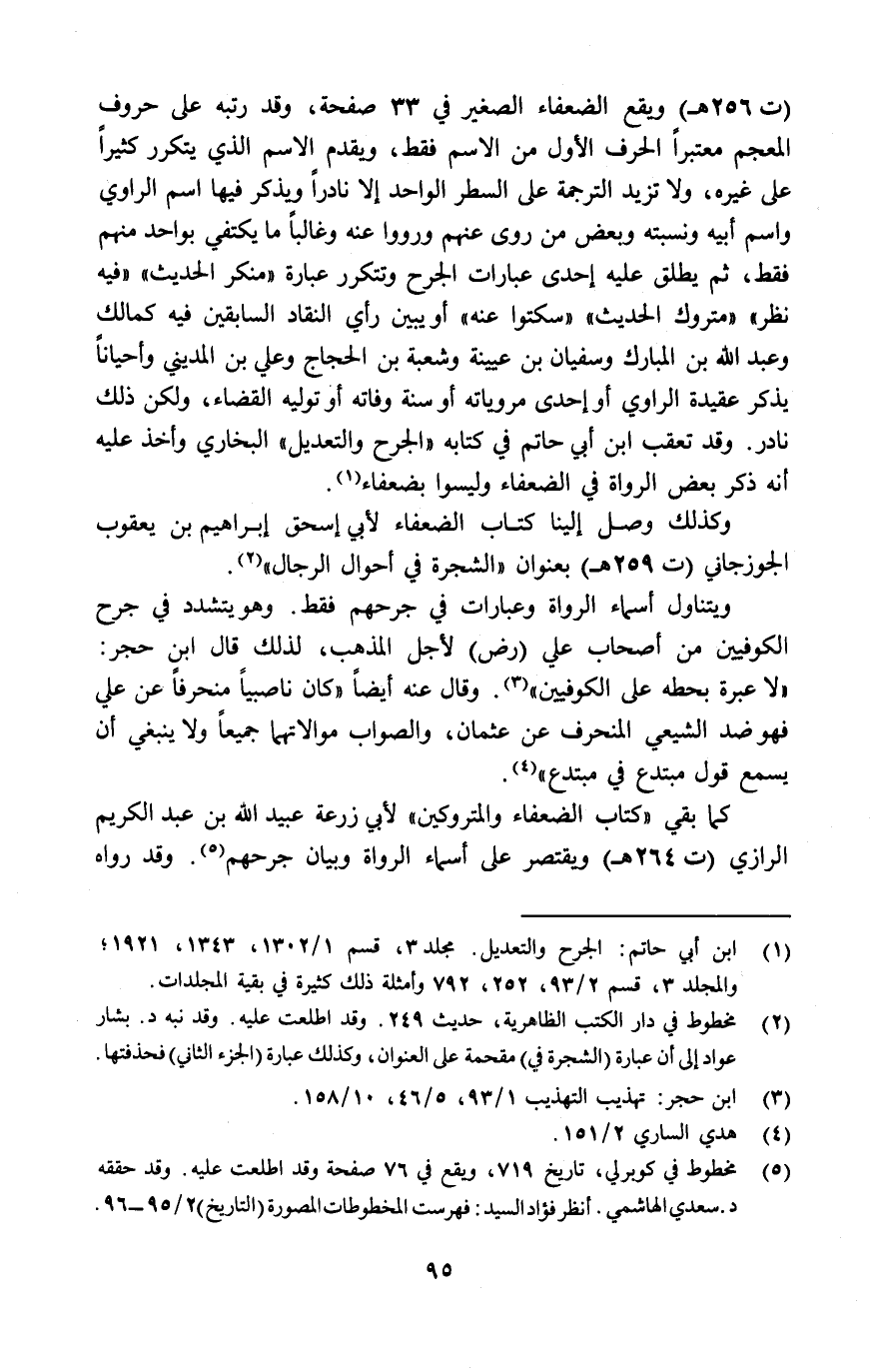 كما بقي "كتاب الضعفاء والمتروكين" لأبي زرعة عبيد الله بن عبد الكريم الرازي "ت264هـ" ويقتصر على أسماء الرواة وبيان جرحهم5. وقد رواه