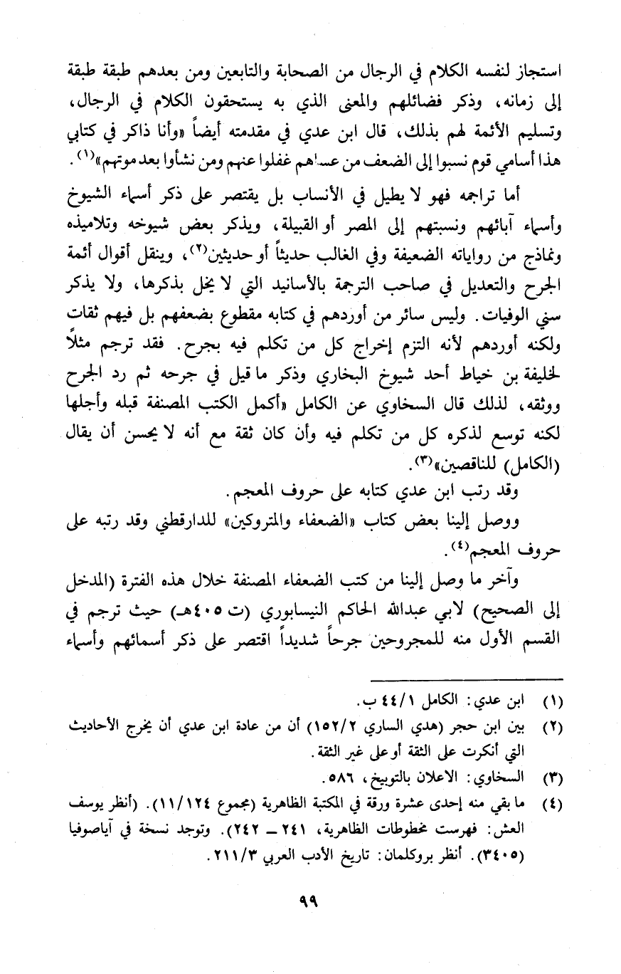 استجاز لنفسه الكلام في الرجال من الصحابة والتابعين ومن بعدهم طبقة طبقة إلى زمانه، وذكر فضائلهم والمعنى الذي به يستحقون الكلام في الرجال، وتسليم الأئمة لهم بذلك، قال ابن عدي في مقدمته أيضا "وأنا ذاكر في كتابي هذا أسامي قوم نسبوا إلى الضعف من عساهم غفلوا عنهم ومن نشأوا بعد موتهم"1.