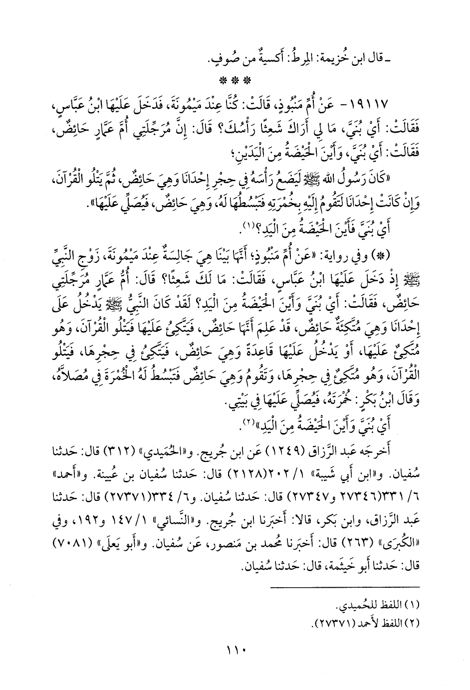 ١٩١١٧ - عن أم منبوذ، قالت: كنا عند ميمونة، فدخل عليها ابن عباس، فقالت: أي بني، ما لي أراك شعثا رأسك؟ قال: إن مرجلتي أم عمار حائض، فقالت: أي بني، وأين الحيضة من اليدين؛